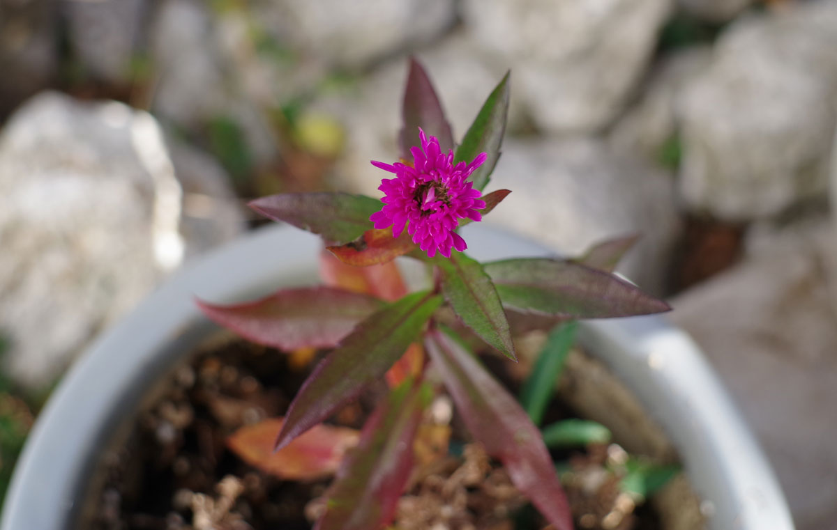 テラスの放りっぱなしのプランター、その一つに花が咲いていました。名前を忘れてしまったのだけど、ケイトウの種類の花だったと思います。冬の寒い中で、健気に咲いているので驚いてしまいました。