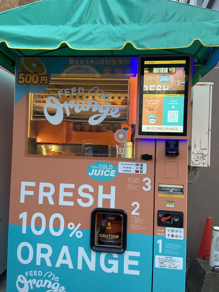 さて、美味しいビールを昼間から飲んで、歩いていたら、こんな自動販売機が!生搾りオレンジジュース自動販売機です。覗いたら、オレンジがいっぱい見えました。面白い自販機があるんだなって、通り過ぎただけですが。